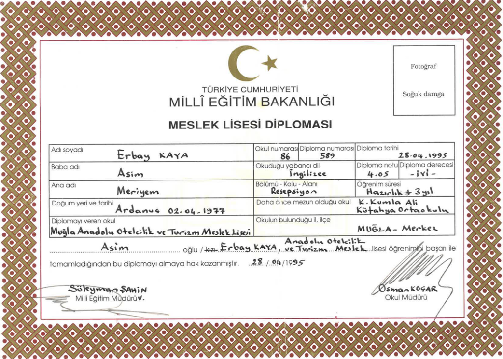 Bu alaylı ruhu, akademik bir disiplinle taçlandırmak istedim. Lise eğitimimi ailemden uzakta, Muğla Anadolu Otelcilik ve Turizm Meslek Lisesi’nde tamamladım. Hem okuyup hem çalışarak geçirdiğim bu yılları, okul birinciliği derecesiyle bitirdim. Ardından Anadolu Üniversitesi İşletme Fakültesi’nden mezun olarak, turizmin sadece bir hizmet değil, matematiksel bir işletme yönetimi olduğunu kavradım.